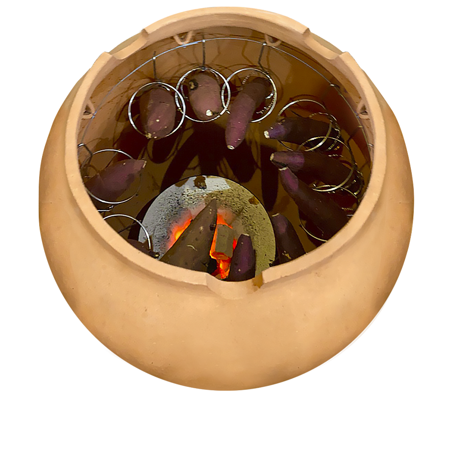 さつまいもは約60℃から70℃付近で加熱することで酵素の働きによりデンプンが麦芽糖に変化します。この変化は一般的な加熱方法ではこの温度を早く通り過ぎてしまいます。つぼ焼いもは炭の熱と、つぼの反射熱でゆっくり時間をかけて焼くため麦芽糖へ変化する温度を最大限に長く保つことができます。芋二郎では炭の火力管理を徹底していますので甘くて美味しい焼いもになります。